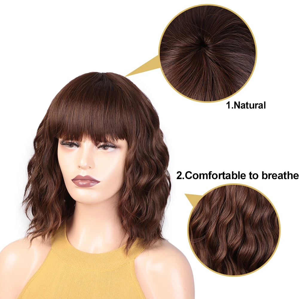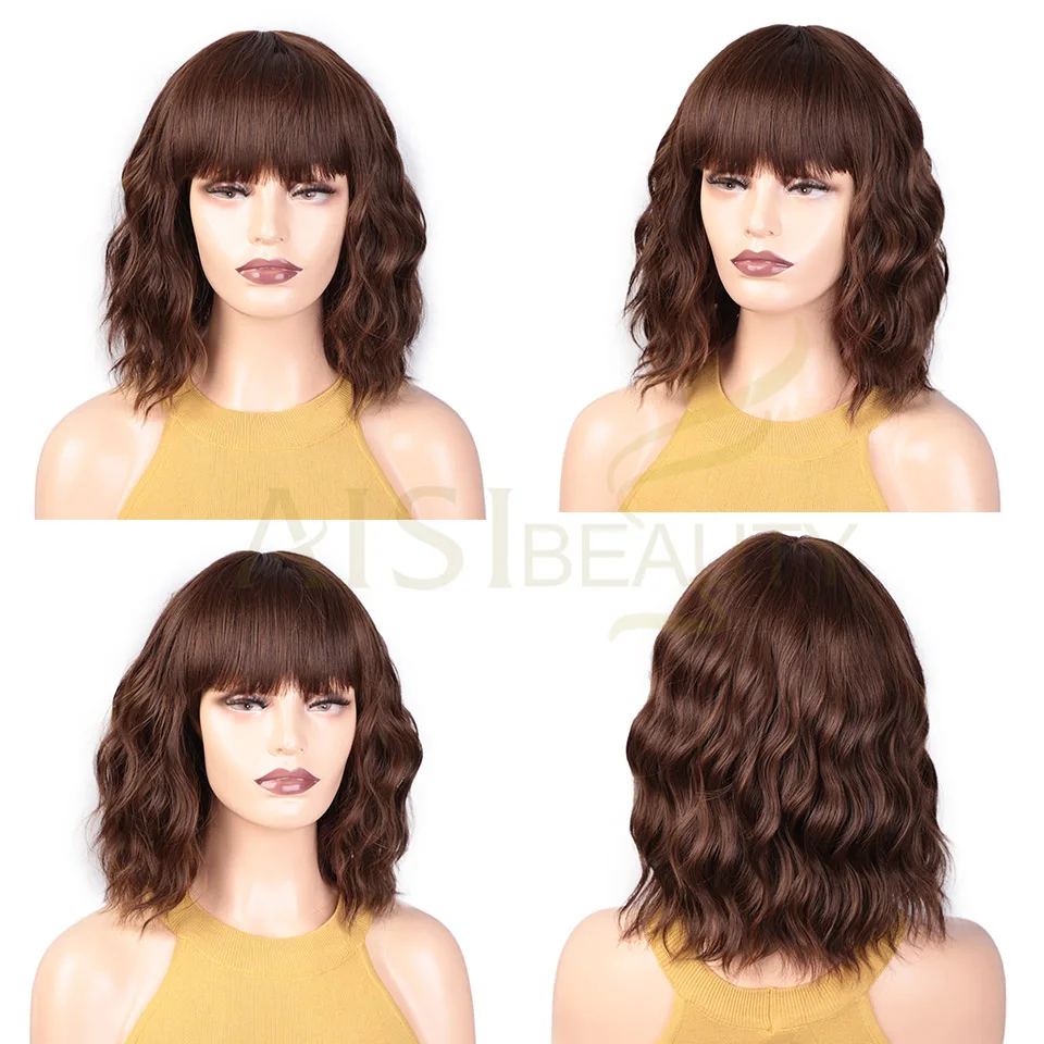 AISI BEAUTY Short Water Wave Synthetic Wigs with Bangs Brown Bob wigs for Women Black Red Cosplay D