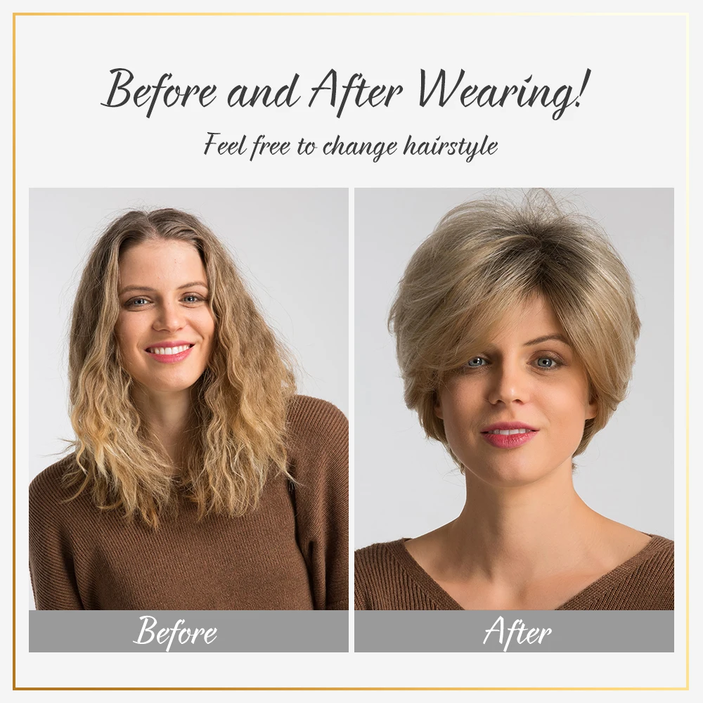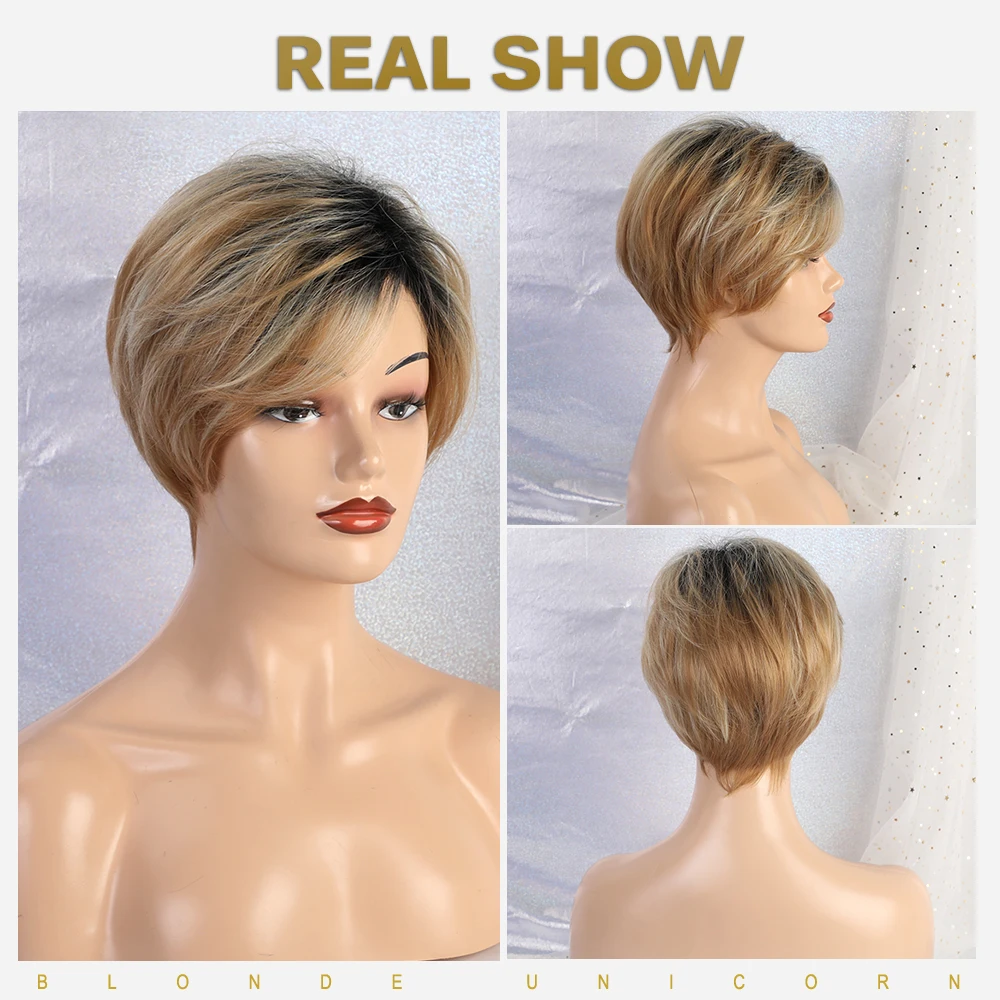 Blonde Unicorn 8 Inch Synthetic Pixie Cut Women Wigs with Natural Bang Fluffy Straight 50% Human Ha